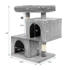 - Provides two perches at different levels—a round perch and a hammock-shaped perch—for your cat to lounge, play and nap on.