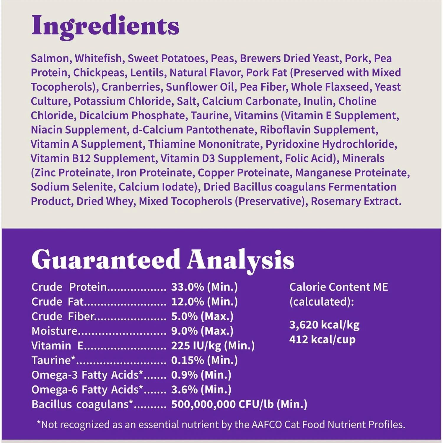 - Premium dry adult cat food made with real, whole, wild-caught salmon as the first ingredient.