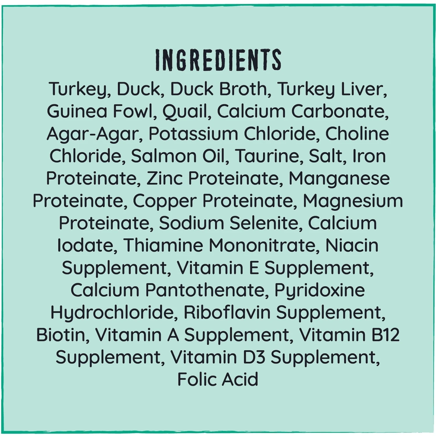 | Flavor | Duck & Liver, Salmon, Trout & Duck Liver, Turkey & Liver, Salmon, Mackerel & Sardine, Beef, Chicken & Liver, Lamb, Chicken & Salmon, Lamb & Liver, Gamebird Poultry |