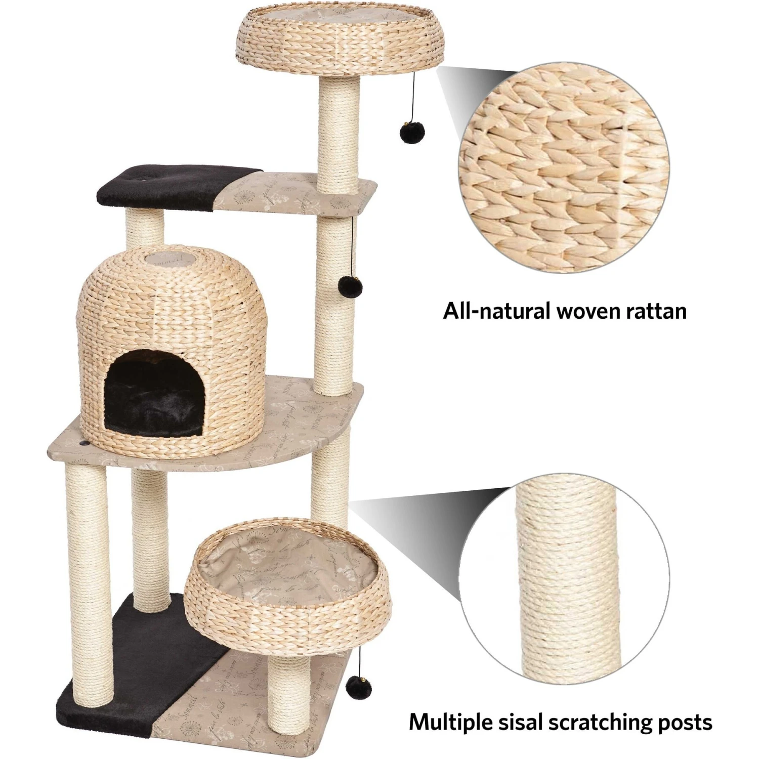 - Durable cat tree made of stunning, all-natural woven rattan.