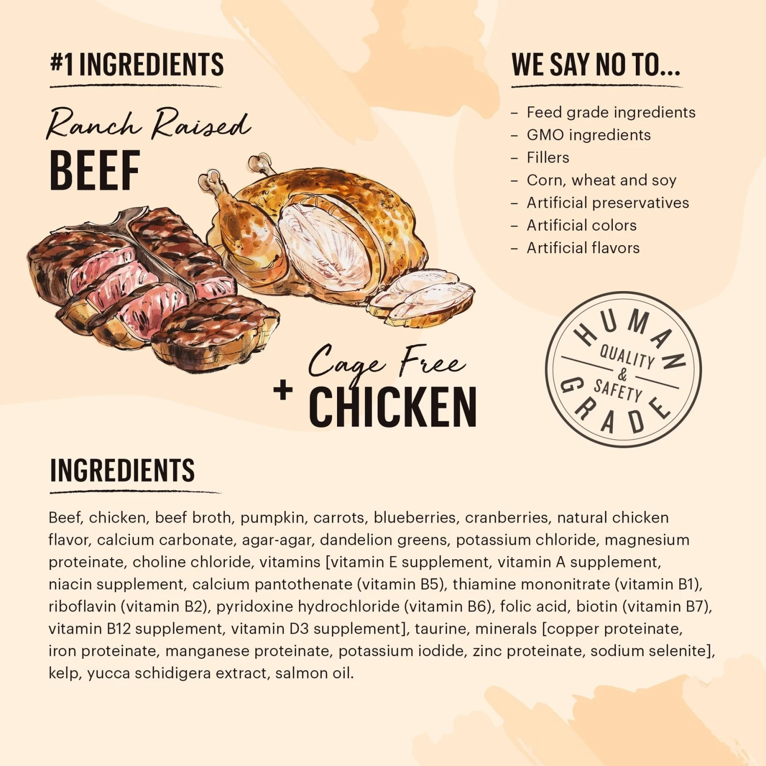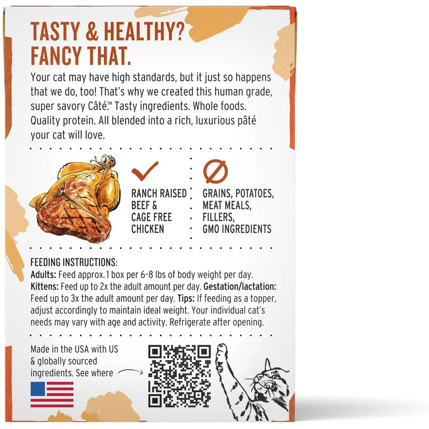 The Honest Kitchen Grain-Free Beef & Chicken Pate Wet Cat Food, 5.5-oz, case of 12—Give your kitty the nutrition she needs with The Honest Kitchen Cate Grain Free Beef & Chicken Pate Wet Cat Food! This grain- and filler-free recipe is purr-pared with 100% human-grade ranch-raised beef and cage-free chicken in a savory bone broth gravy to maintain appropriate nutrients, protein levels and crave-worthy taste. Even the most finicky feline will me-wow at the irresistible taste, and you can rest easy knowing you’re giving her a fur-esh, high-quality meal!