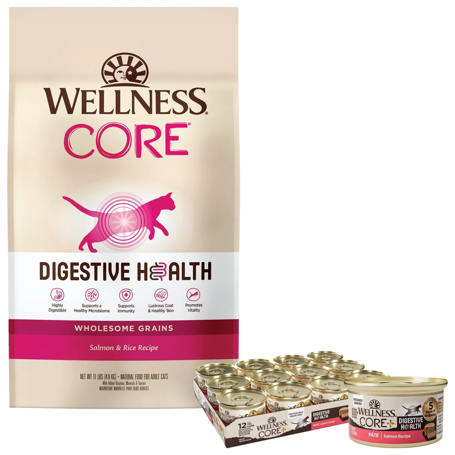 Wellness CORE Digestive Health Salmon Pate Recipe Grain-Free Wet Cat Food, 3-oz, Case Of 12 & Wellness CORE Digestive Health Wholesome Grains Salmon & Rice Recipe Dry Cat Food